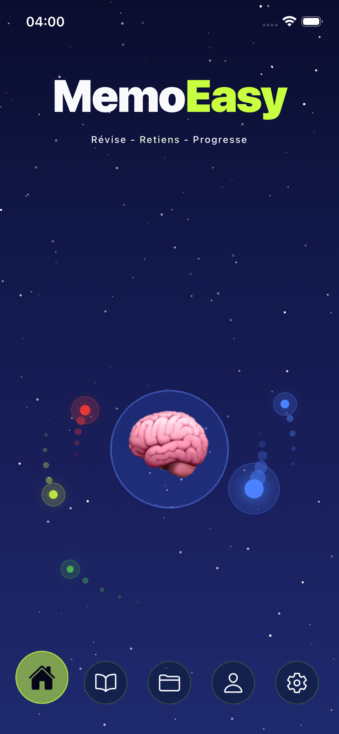 En bas : la barre de navigation pour accéder à tes fiches, sujets et paramètres.