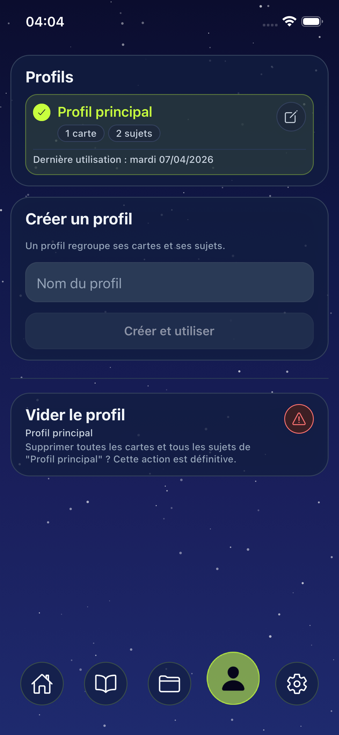 Chaque profil est un espace indépendant avec ses propres fiches et sujets. Pratique pour séparer le travail, les études, ou plusieurs utilisateurs sur le même appareil.